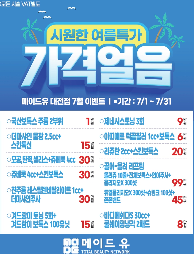 현재 메이드유의원 대전점에서는 **7월 한 달간 시원한 여름특가 이벤트**를 진행 중입니다.