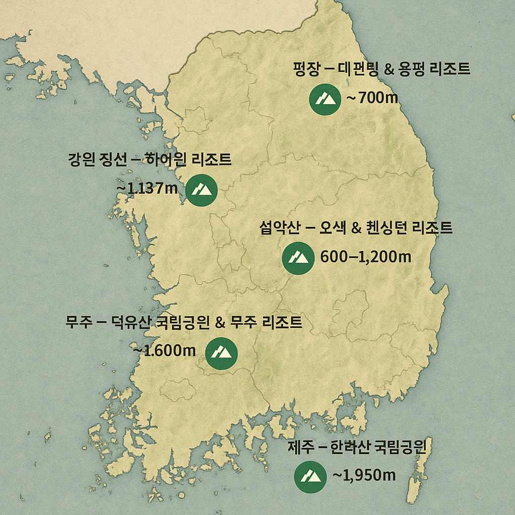 정선 하이원 리조트는 고도 1,100m 이상의 고산 지대에 자리합니다.